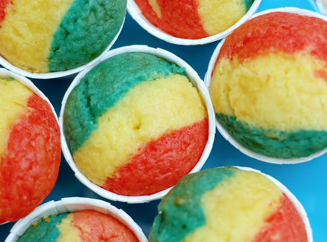 - Divide batter evenly into three bowls. Tint one bowl red and one blue. Spoon batter into decorating bags and tie off the end of the bags with twist ties or rubber bands. Lay the bags side by side in the desired order of coloring and tape around the bottom of the bags. This will help you handle the bags when piping the batter. (I found that my decorating bags had a slippery coating and only duct tape worked.)