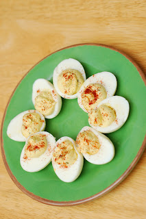 Here’s a spin on a traditional favorite! I like deviled eggs, but I don’t like the load of mayo that comes with them. Recipes call for anywhere from 1/3 cup to 2/3 cup mayo for a dozen eggs. At 10 grams of fat per tablespoon (livestrong.com), that’s anywhere from 50-110 grams of fat!! Yikes! I swapped out the mayo for plain low-fat yogurt, gave them to my husband to try, and he didn’t know that there was anything different about them. The taste hardly changed and my arteries thanked me for thinking of them. 🙂