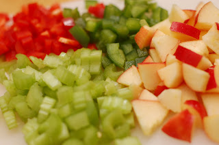 - In a large bowl, mix together rice, apples, peppers, celery, and chicken. Drizzle dressing mixture over the top and toss lightly until combined.